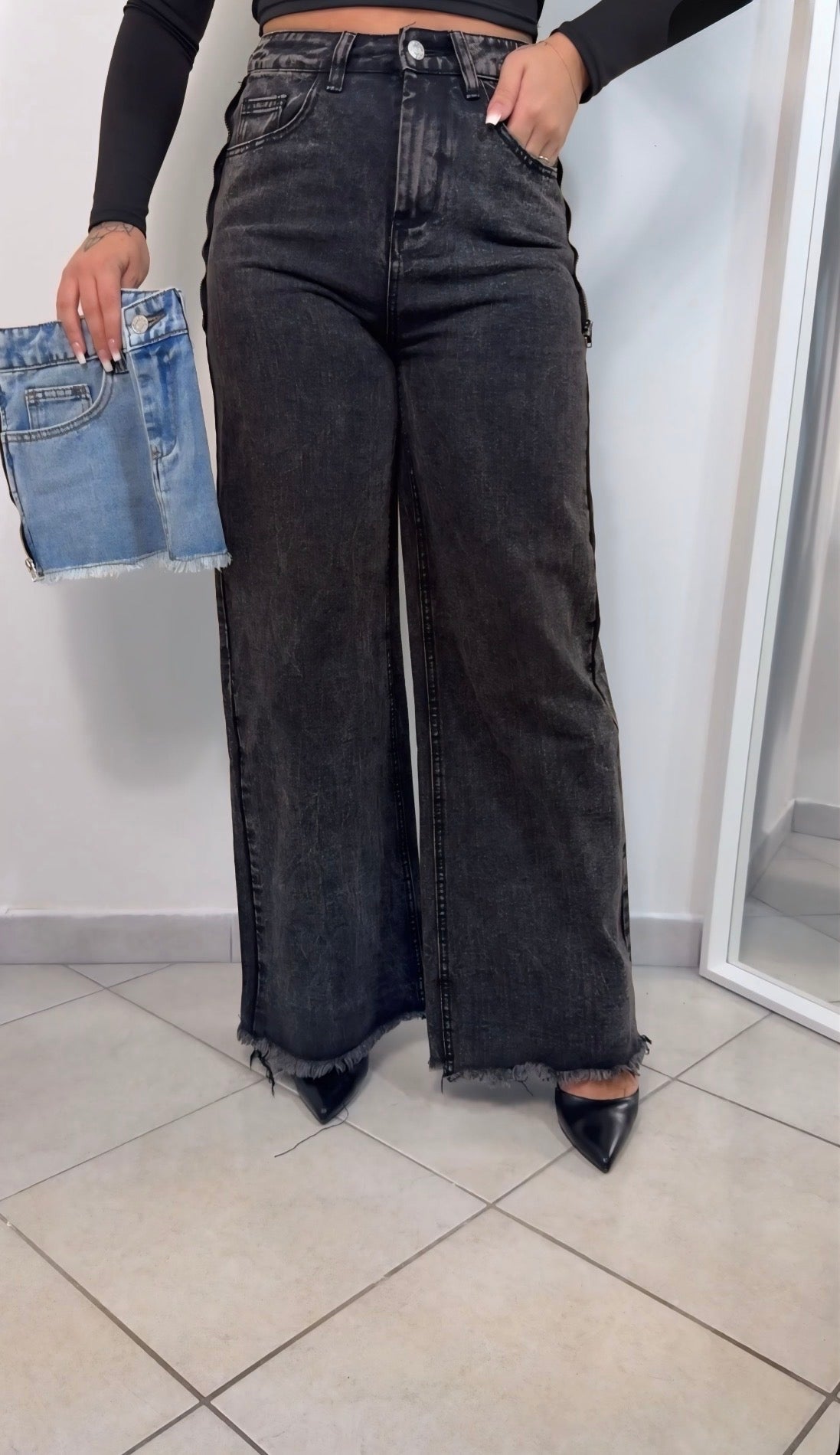 Jeans da donna con particolarità davanti rimovibile, veste regolarmente la propria taglia essendo un jeans in tela fissa.