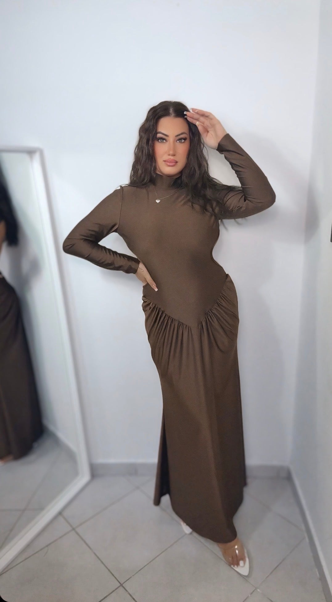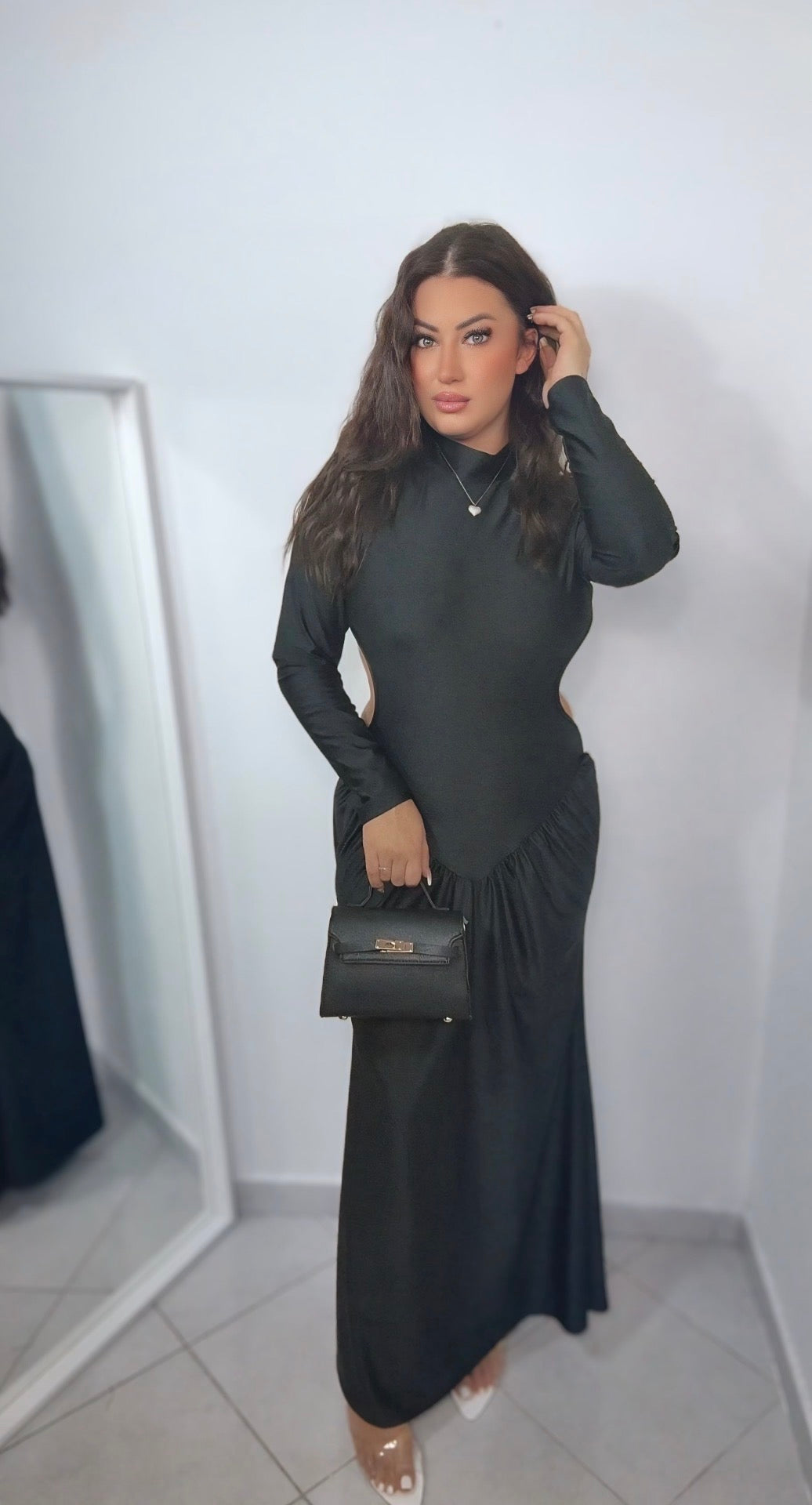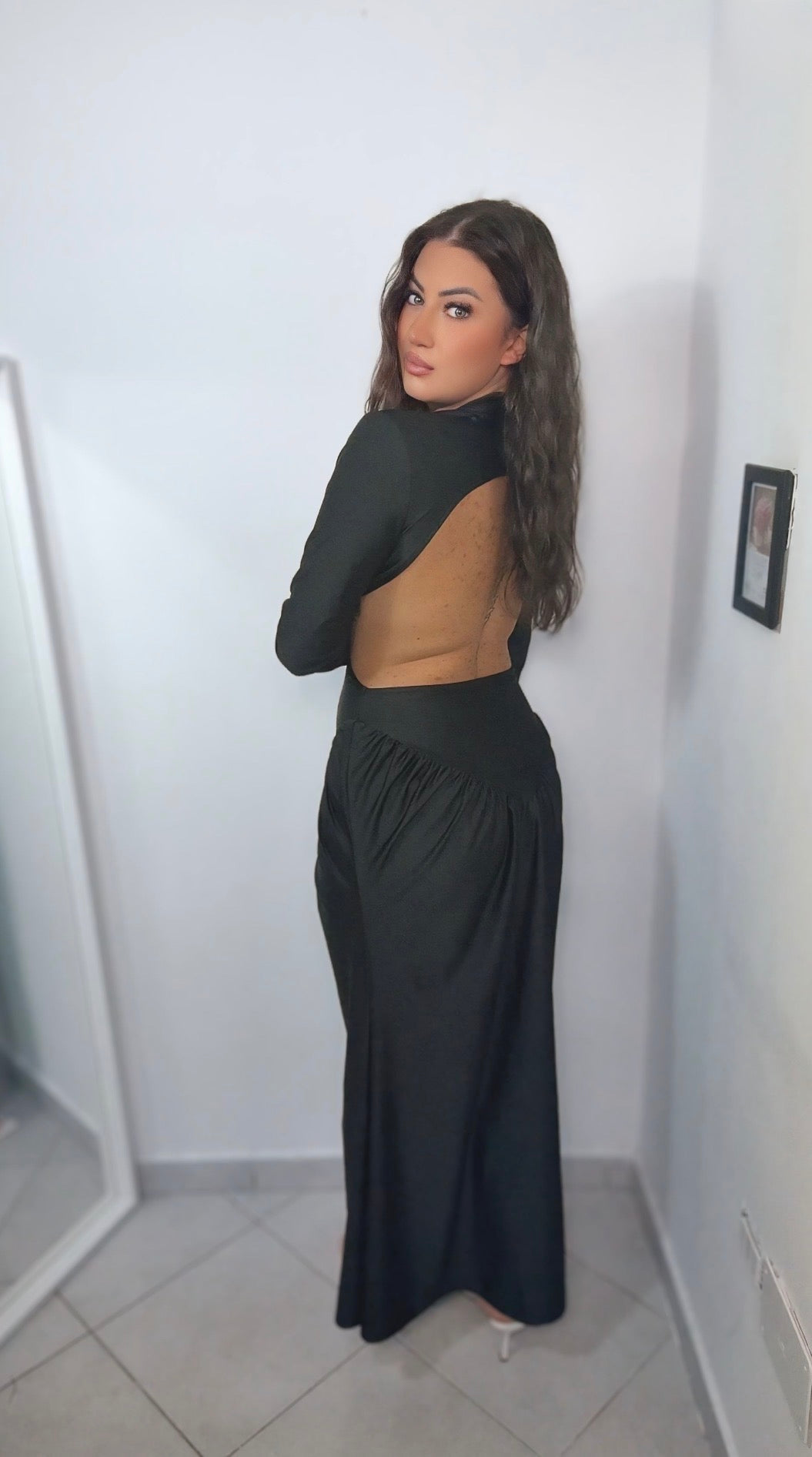Abito aderente e accollato nella parte superiore con un ampia scollatura sulla schiena.
